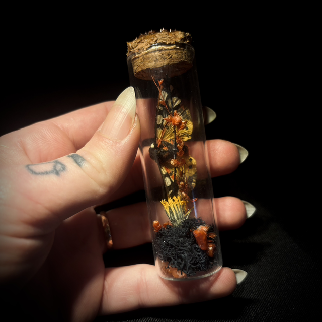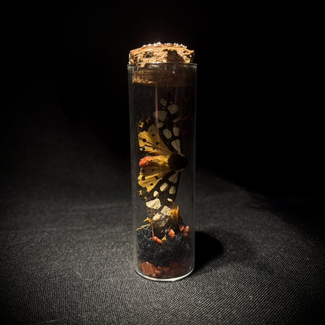 - Papillon de nuit aux teintes orangées, avec végétaux et petites pierres polies.