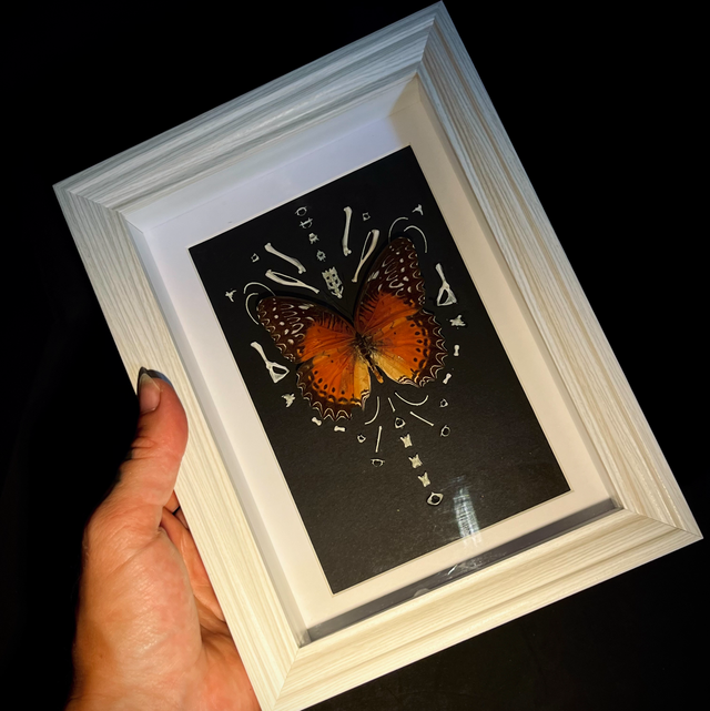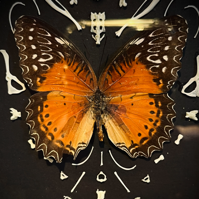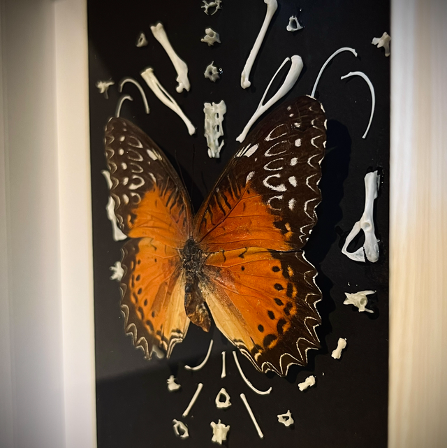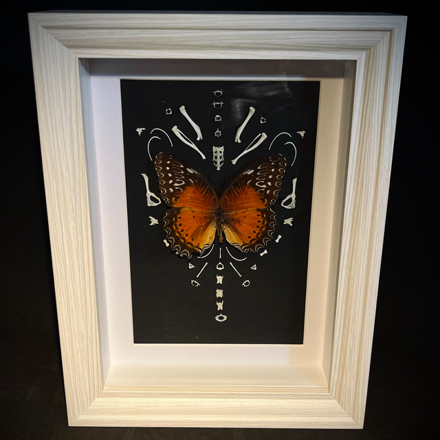 Encadrée sous verre, cette composition entomologique et ostéologique est une relique à la fois fragile, à la fois brutale — à suspendre, ou à contempler comme un sort.